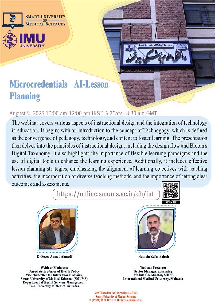 دانشگاه علوم پزشکی هوشمند، وبینار بین المللی Microcredentials AI – Lesson Planning را برگزار می نماید.