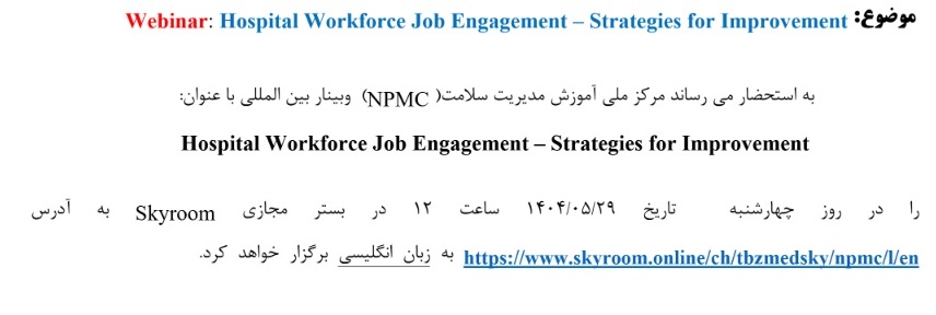وبینار آموزشی بین المللی Hospital Workforce Job Engagement – Strategies for Improvement ۲۹ مرداد ۱۴۰۴ | ۱۰:۰۱ کد : ۵۳۹۲۵ اطلاعیه ارسال به دیگران نام شما ایمیل شما ایمیل دریافتکننده ارسال انصراف تعداد بازدید:۲۳۸۹ وبینار آموزشی بین المللی Hospital Workforce Job Engagement – Strategies for Improvement