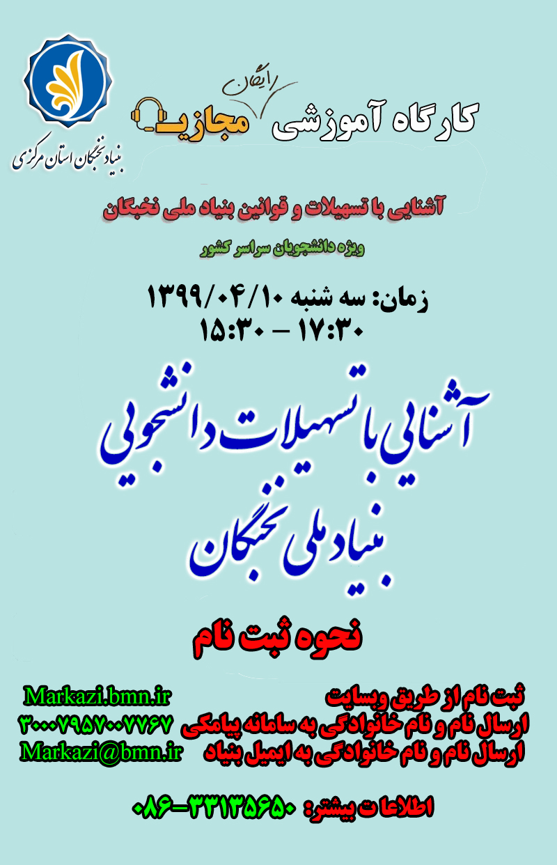 کارگاه آشنایی با تسهیلات و قوانین بنیاد ملی نخبگان ۰۴ تیر ۱۳۹۹ | ۱۲:۳۸ کد : ۱۰۰۶۷ اخبار اصلی ارسال به دیگران نام شما ایمیل شما ایمیل دریافتکننده ارسال انصراف تعداد بازدید:۲۱۹۹