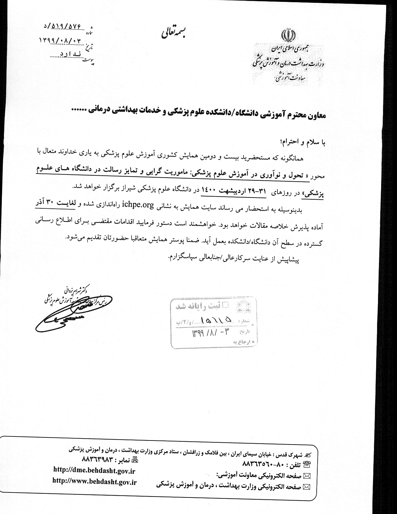 مهلت ارسال خلاصه مقالات در سامانه کشوری: 1 آبان لغایت 30 آذر ماه 1399 می باشد.