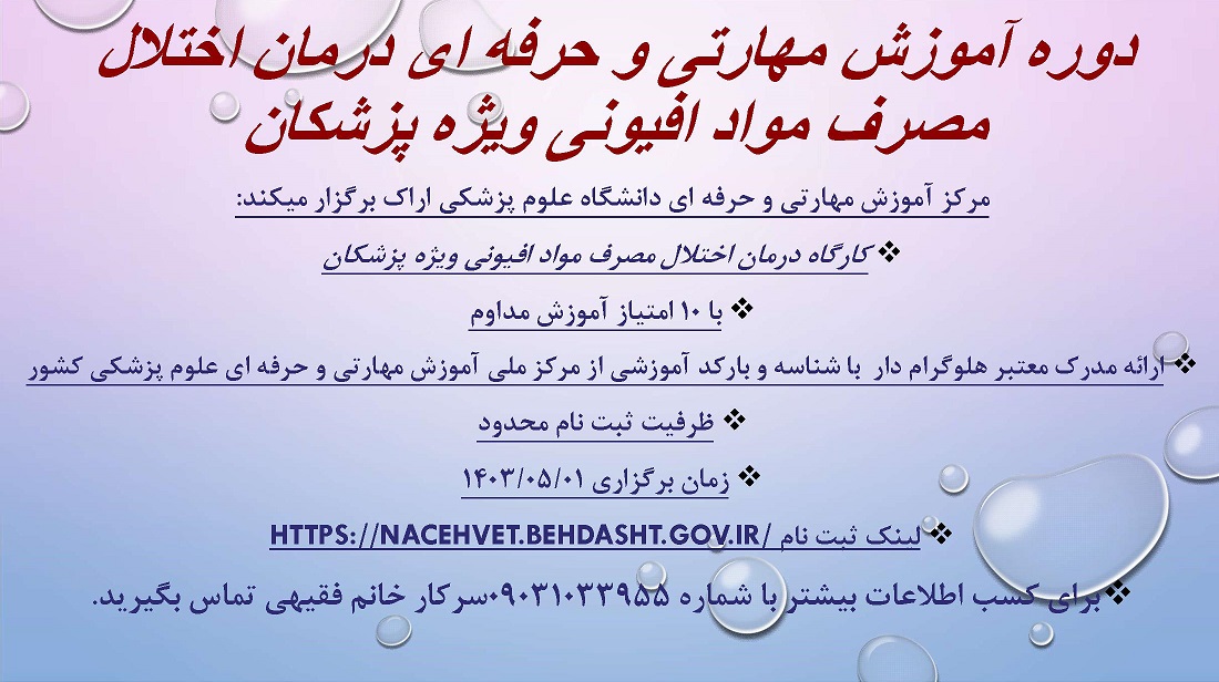 مرکز آموزش مهارتی و حرفه ای دانشگاه علوم پزشکی اراک در نظر دارد دوره آموزشی و مهارتی "درمان اختلال مصرف مواد افیونی ویژه پزشکان" را برگزار نماید