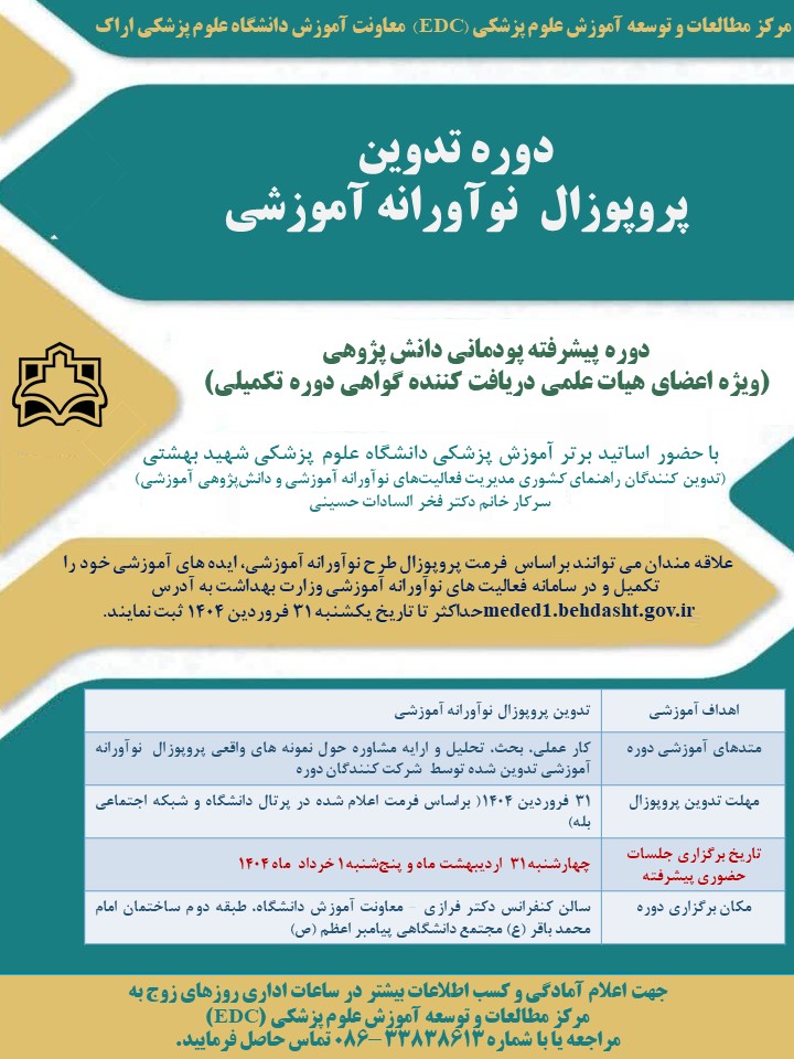 دوره پیشرفته پودمانی دانش پژوهی با عنوان کارگاه نگارش و تدوین پروپوزال نوآورانه آموزشی ۲۷ اسفند ۱۴۰۳ | ۱۲:۵۷ کد : ۵۰۱۹۴ اخبار اسلایدی اخبار اصلی ارسال به دیگران نام شما ایمیل شما ایمیل دریافتکننده ارسال انصراف تعداد بازدید:۷۳۲ جهت دریافت فرمت پروپوزال نوآورانه آموزشی کلیک کنید.