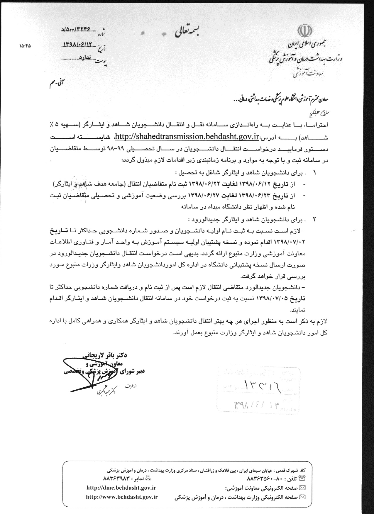 قابل توجه دانشجویان متقاضی نقل وانتقال دانشجویان شاهد وایثارگر (سهمیه ۵ درصد ) ۱۳ شهریور ۱۳۹۸ | ۱۲:۵۸ کد : ۵۵۶۷ اخبار اصلی ارسال به دیگران نام شما ایمیل شما ایمیل دریافتکننده ارسال انصراف تعداد بازدید:۲۰۵۳