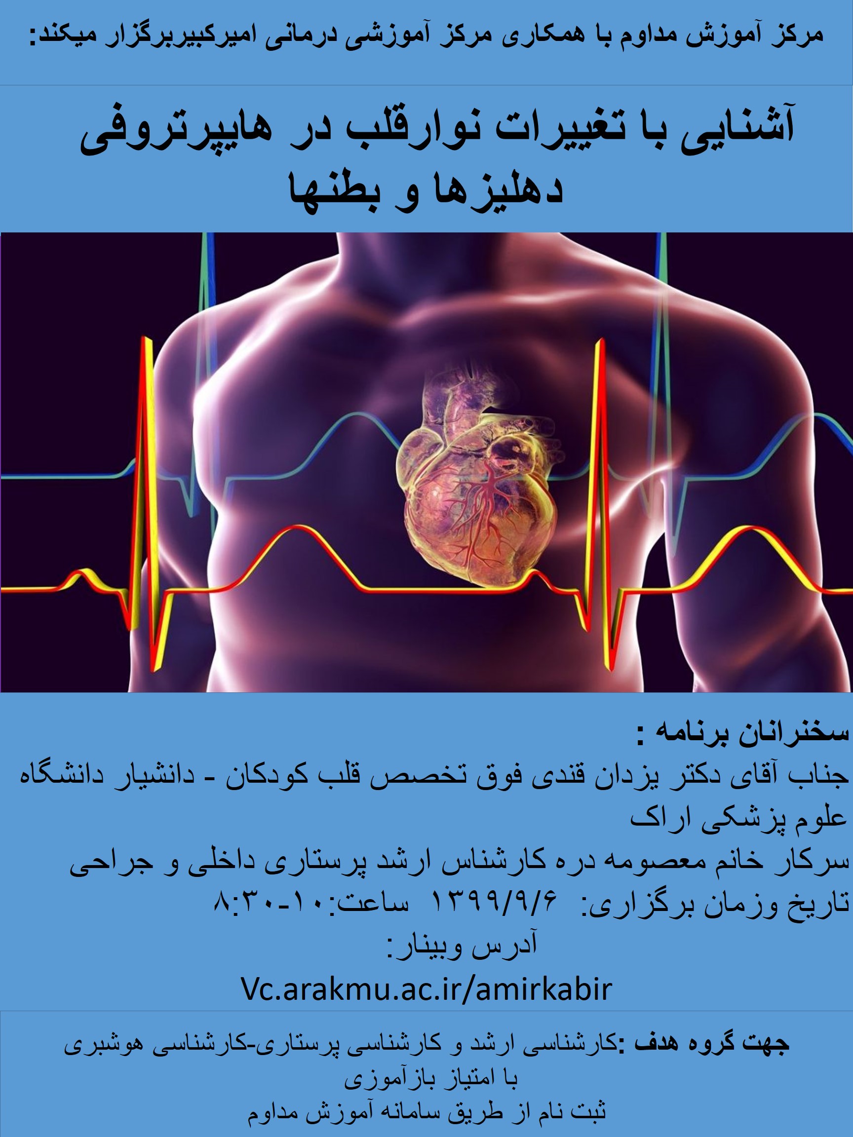 | 5 | 1400/03/05 | 10-13 | مدیریت بحران و تریاژ در مراکز درمانی با تاکید بر اپیدمی کووید19 | مرکز آموزشی درمانی امیرالمومنین(ع) | کارشناس ارشد/کارشناس پرستاری | محدوددانشگاهی | |