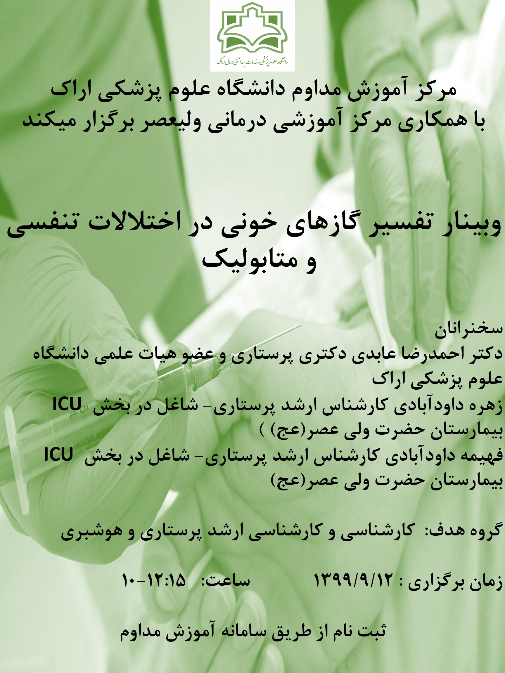 | 1399/11/25 | 10-12:45 | اقدامات پرستاری در روشهای تشخیصی بیماریهای مغز و اعصاب | مرکز درمانی آموزشی ولی عصر(عج) | 1399/12/23 | 16 |