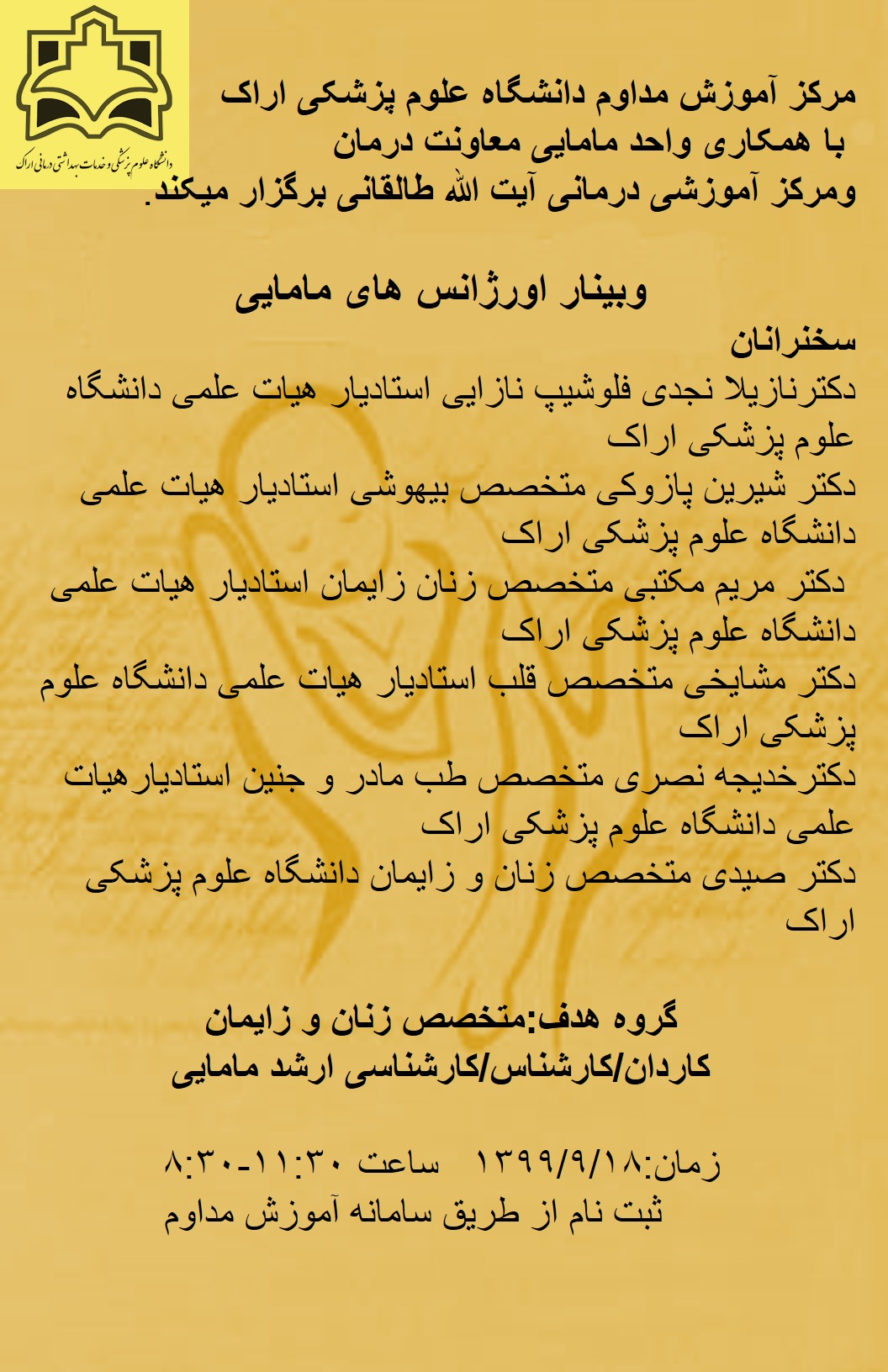 | 2 | 1401/03/10 | 8:30-11:30 | اختلال عملکرد جنسی در زنان | مدیر گروه مامایی دانشکده پزشکی | دکتری-کارشناسی ارشد-کارشناس-کاردان مامایی | 1401/03/04 | 08:45 |