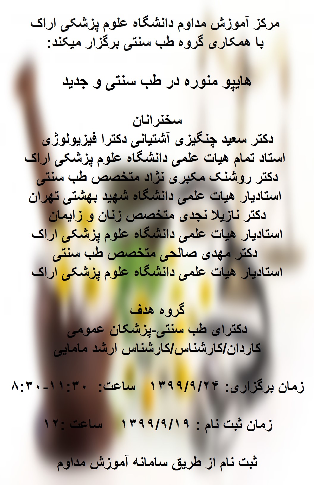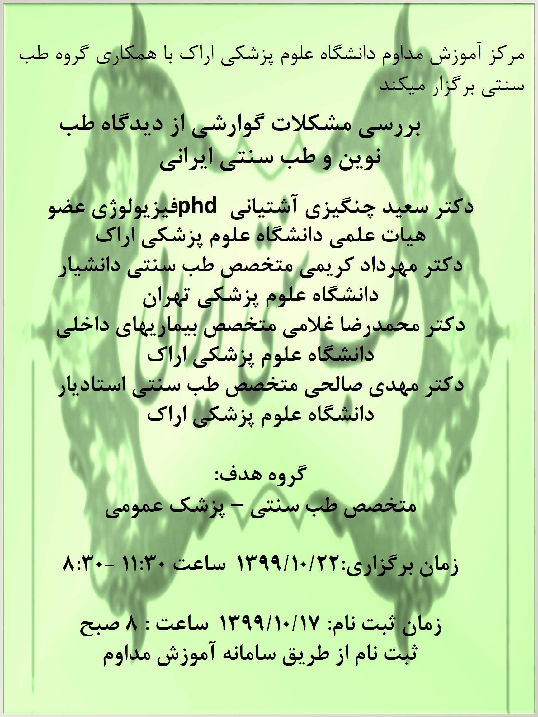 | 1399/12/11 | 8:30-11:30 | هایپر لیپیدمی و بررسی دیدگاه های طب سنتی و طب نوین | گروه طب سنتی | 1399/12/02 | 15 |