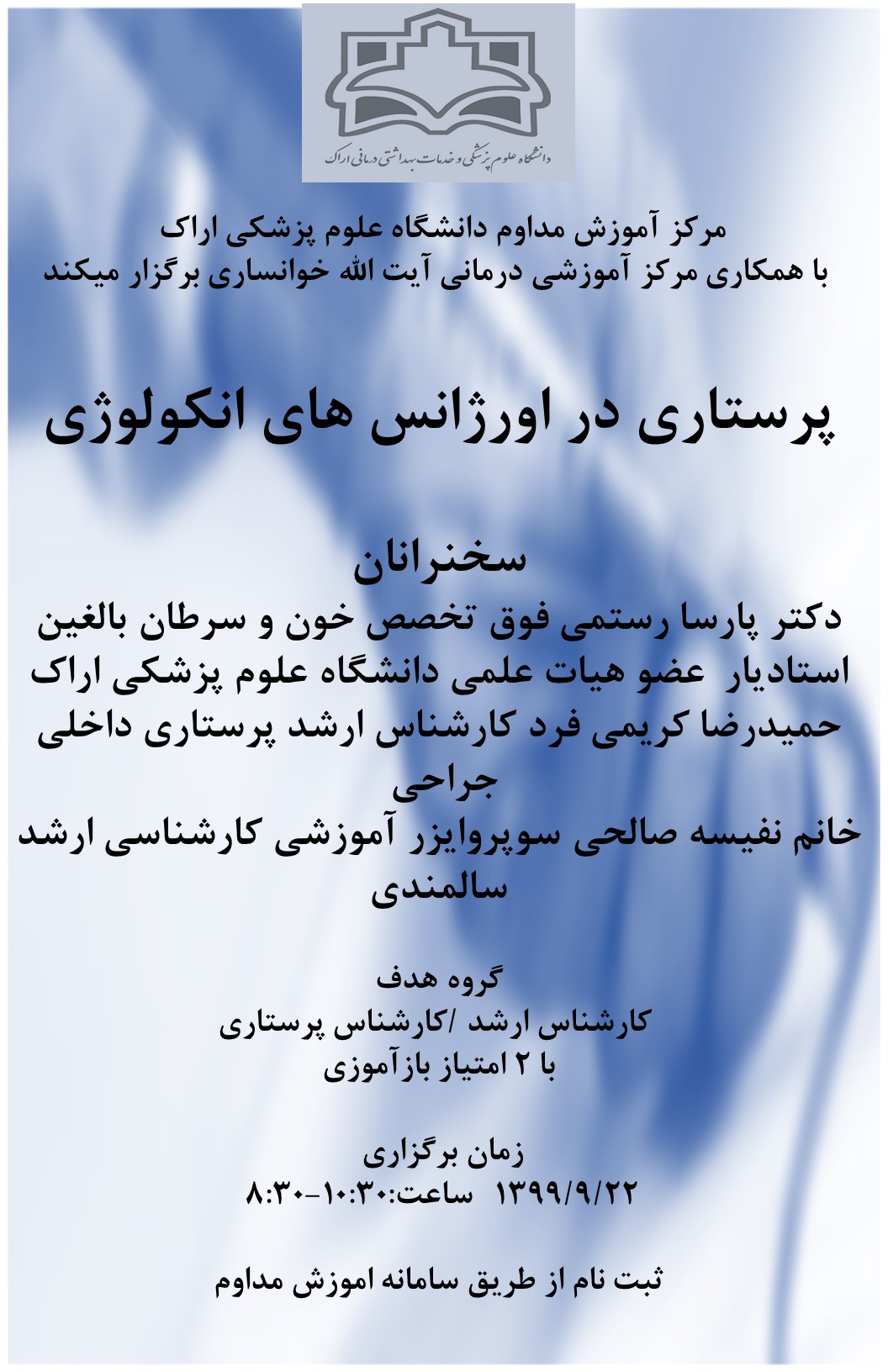 | 7 | 1400/03/09 | 16-19 | پیشگیری از خطاهای دارویی در مراقبت های پرستاری | دانشکده پرستاری شازند | کارشناس ارشد/کارشناس پرستاری | 1400/03/22 | 13 |