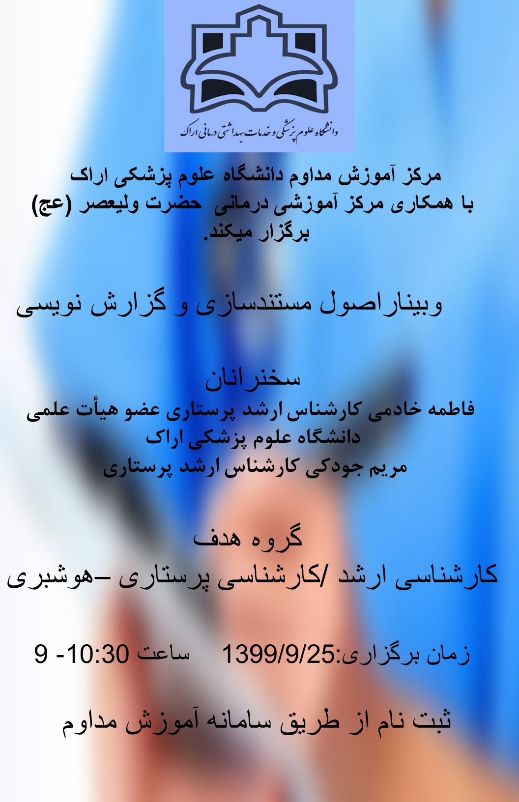 | 10 | 1401/03/26 | 16-19 | مراقبت پرستاری از زخم 6 (زخم بستر) | دانشکده پرستاری شازند با همکاری هیئت مدیره نظام پرستاری اراک | کارشناسی ارشد-کارشناس پرستاری -مامایی | 1401/03/09 | 9 |
