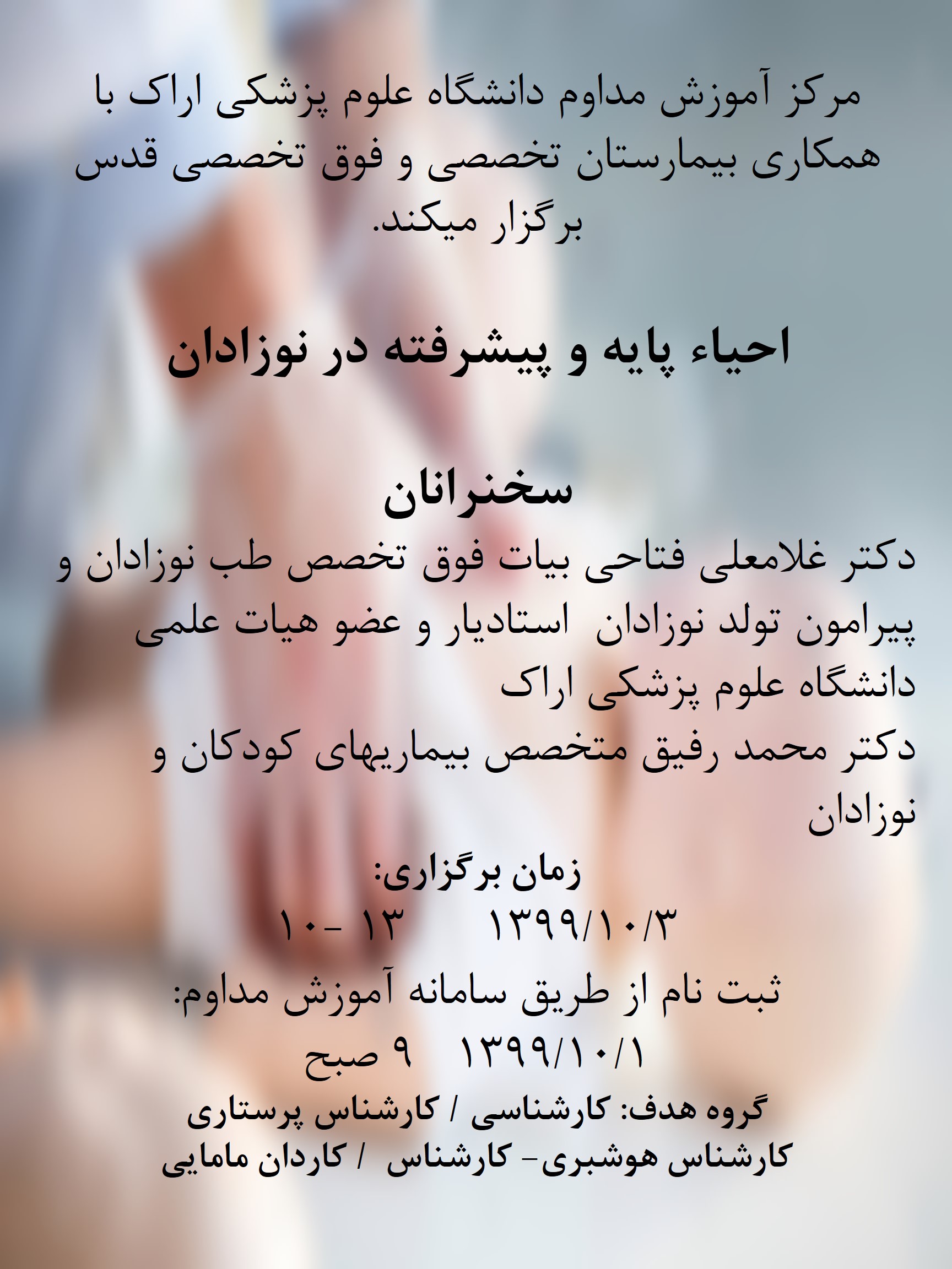 | 1399/11/28 | 9-12:15 | احیا پیشرفته نوزاد | مرکز آموزشی درمانی امیرکبیر | 1399/11/20 | 9 |
