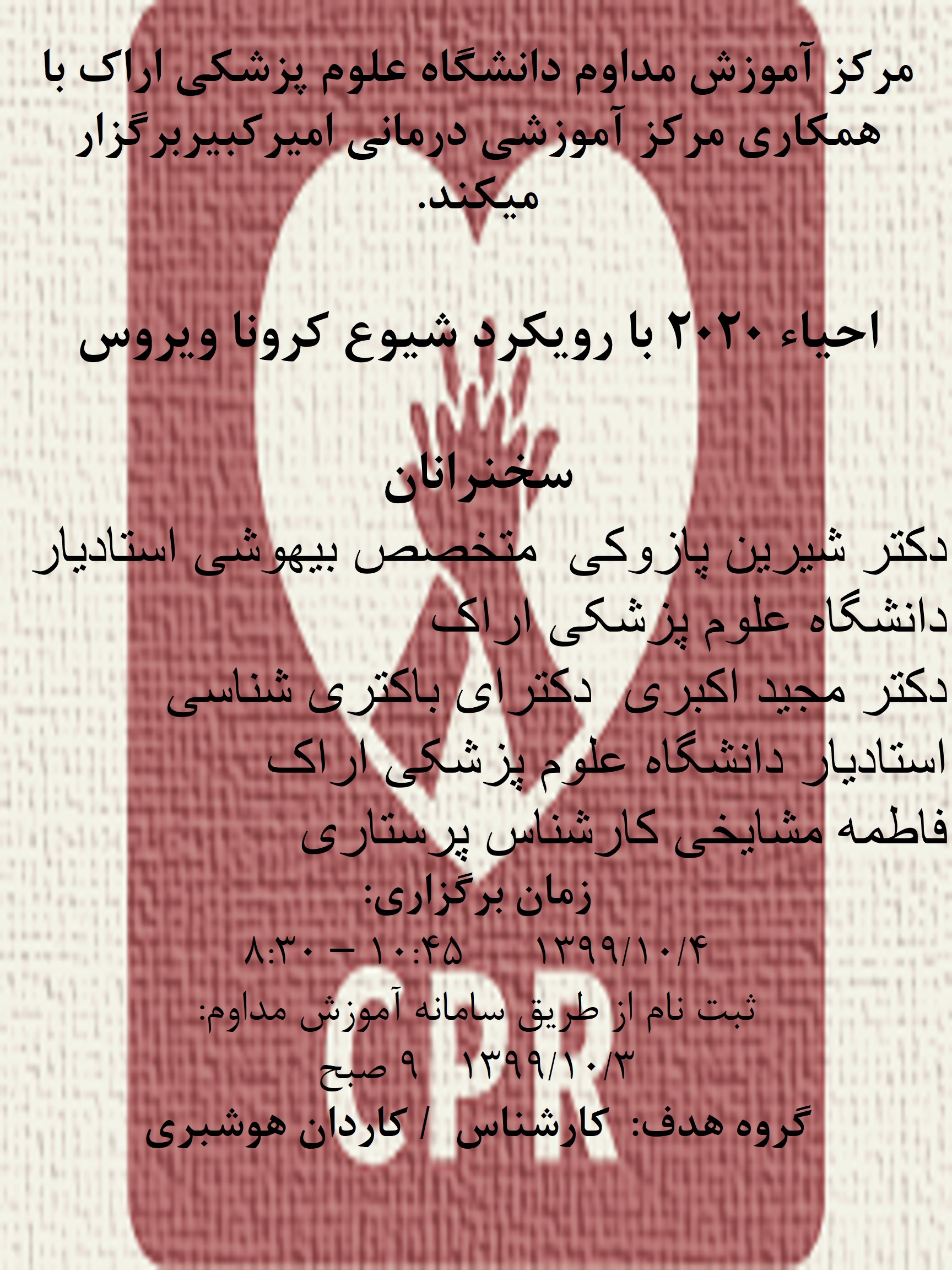 | 17 | 1400/02/26 | 9-12 | تازه های احیا قلبی ریوی دربیماری کووید19 براساس ویرایش2020 | مرکز آموزشی درمانی امیرالمومنین(ع) | کارشناس پرستاری | محدوددانشگاهی | ||